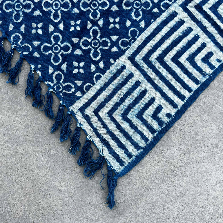 The dyed fabric is gently sun-dried, allowing the indigo to undergo oxidation, gradually revealing its iconic blue hue, radiant as the Indian sky. Each throw is lovingly finished with hand-stitched embroidery or adorned with tassels, adding a touch of authenticity and individuality to every piece.